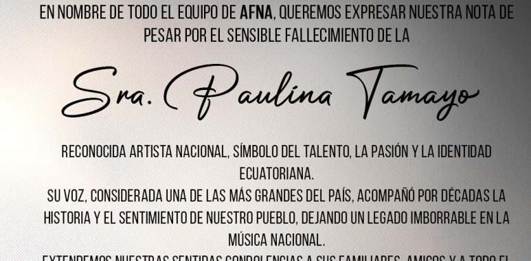 Hoy la música ecuatoriana se viste de luto. Nos despedimos de nuestra querida Paulina Tamayo, “La Grande del Ecuador”, cuya voz inigualable y pasión por nuestros ritmos nos deja un legado imborrable. Su arte vivirá por siempre en cada pasillo, cada albazo, en el corazón de todo un país que la amó y la admiró. Gracias por tanto, eterna Paulina. Descansa en paz. 🕊️